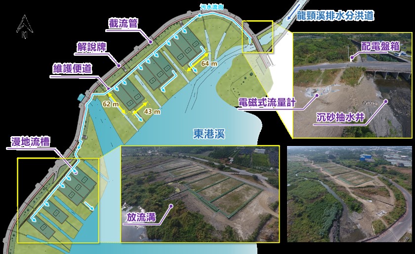 龍頸溪排水分洪道 → 沉沙池 → 進流抽水井 → 漫地流槽 → 放流溝 → 東港溪